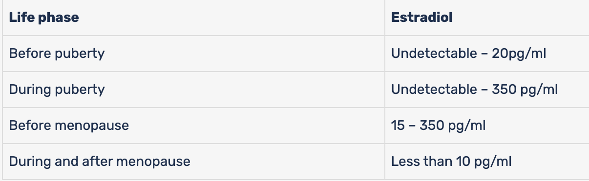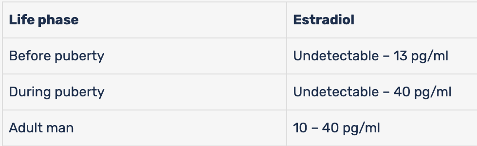 아래는 여성 및 남성의 시기별 에스트로겐 수치 변화 테이블(Mayo Clinic의 자료), 연령대별 남성의 테스토스테론 수치 변화를 보여주는 차트다.
