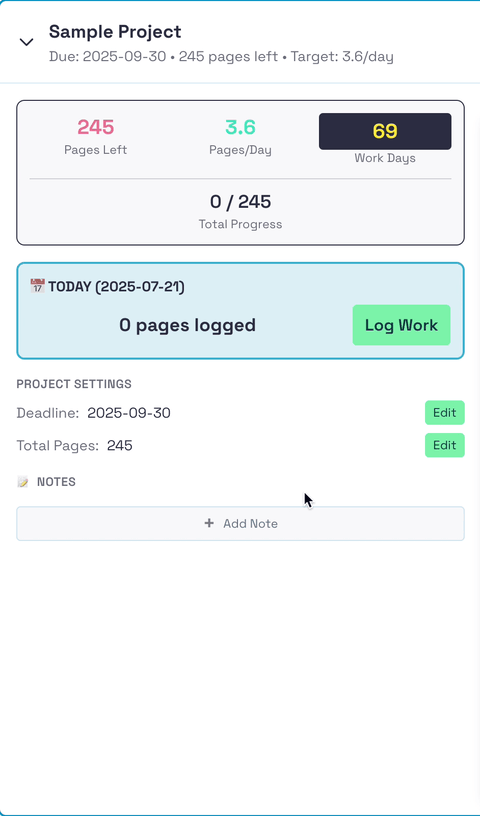 누군가의 불편함을 해소하는 무언가를 만들어보고 싶었다. 나는 번역사 생활을 해본 경험이 있기에, 번역 트래커를 만들었다. 번역 프로젝트는 대부분 마감일과 총 분량이 정해져 있는데, 그걸 매번 수기로 기록하는 것은 귀찮은 일이다. 그래서 데드라인을 입력하면 필요한 일일 작업량을 자동으로 계산해주는 단순한 번역 트래커를 만들었다.